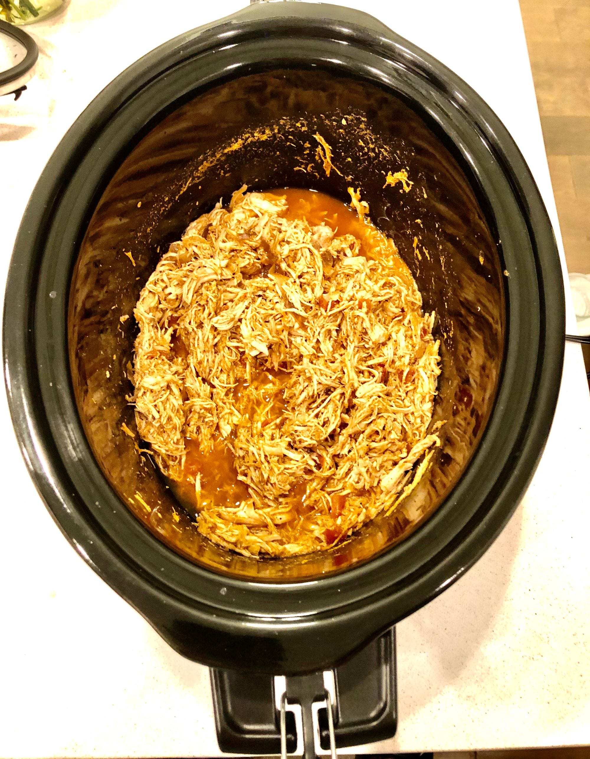 3) Toss it in a slow cooker and add about half a cup of stock. Don't add too much because the chicken will release some juices also. You don't want this too watery. It will drown out all the flavor. Instapot slow cooking is also ok if it works for you. For me, it ends up overcooking or burning my chicken.